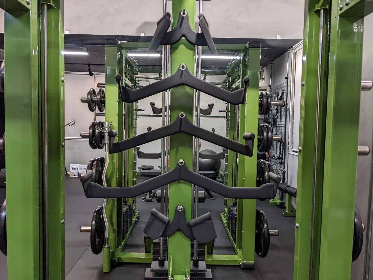 マルチタイプのパワーラックはラットプルダウンができるようになっており、グリップも5つ設置されています。背中の鍛えたい部位を細かく分けて追い込むことができる代物となっておりますのでぜひお試しくださいませ。