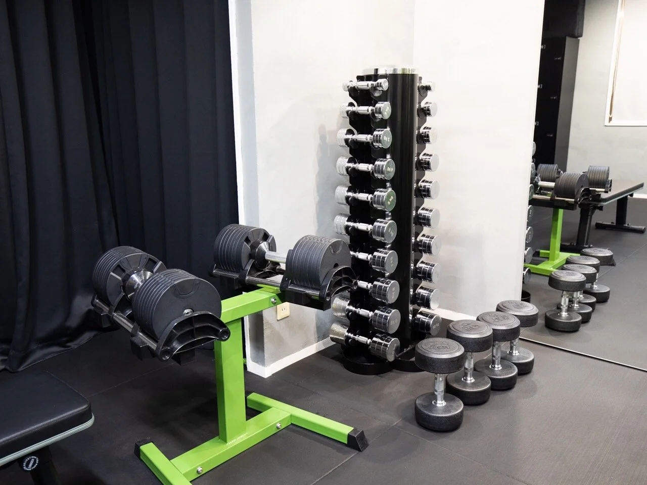 藤沢エリアTHE PERSONレンタルジム藤沢には器具が豊富に揃っております。マルチタイプパワーラックの他にも、ダンベル・ヨガマット、チューブなどがあり、中でも、FLEXBELLの可変式タイプのダンベルと1kg〜10kgまでダンベルがありますので、各トレーニングに応じてご利用が可能となります。