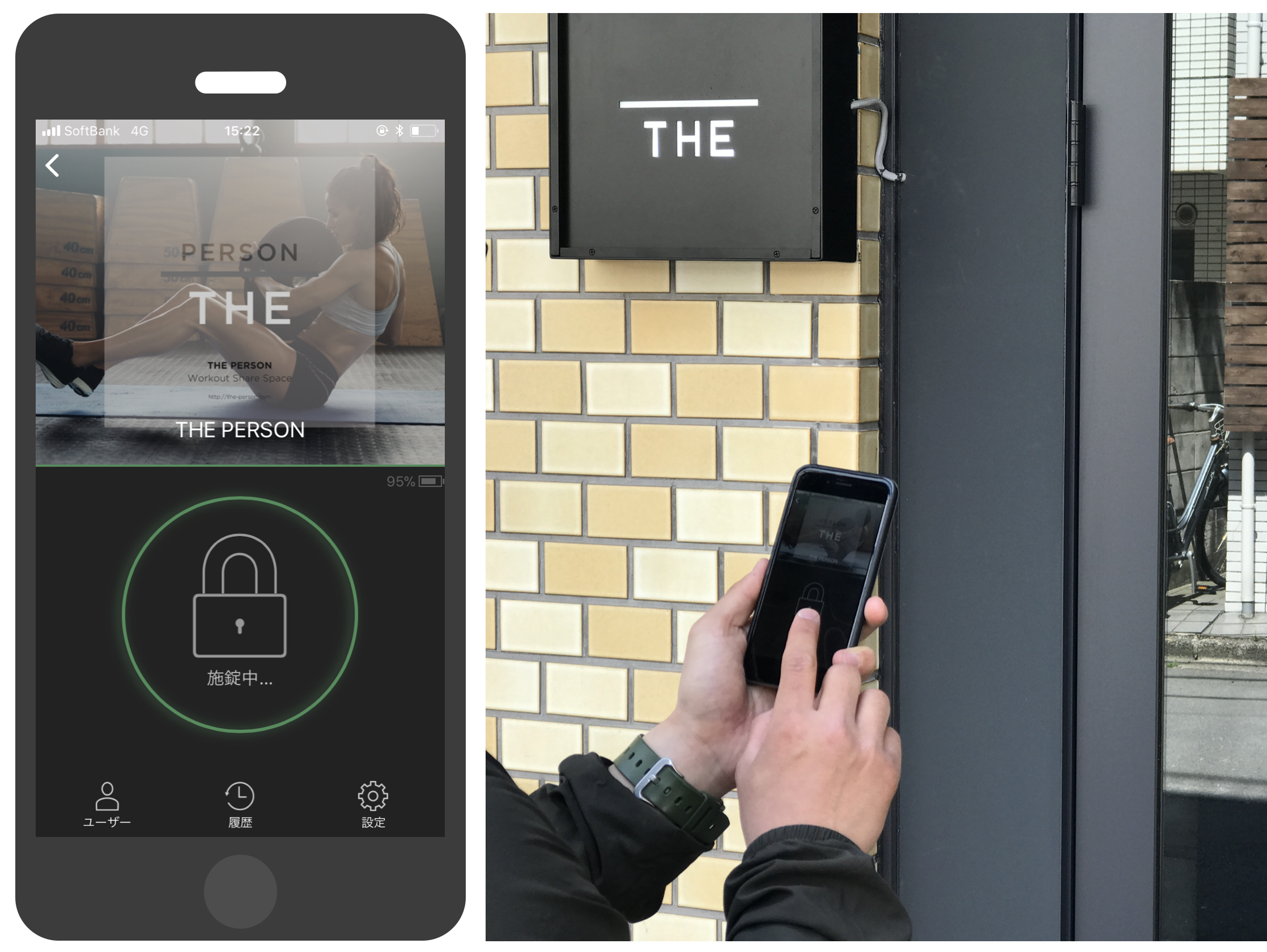 渋谷・新宿のレンタルジムTHEPERSONは、スマートフォンで開閉するニンジャロックというスマートロックを導入し無人のシェアリング専用のジムです。利用登録を済ませたトレーナーは、専用のアプリをダウンロード後、事務局にIDを共有するだけ。ジムを使う際に、ドアの前で、BlueToothをオンにしてアプリを開くだけで、ワンタッチでドアの開閉ができるので、入り口での手続きなどは不要です。