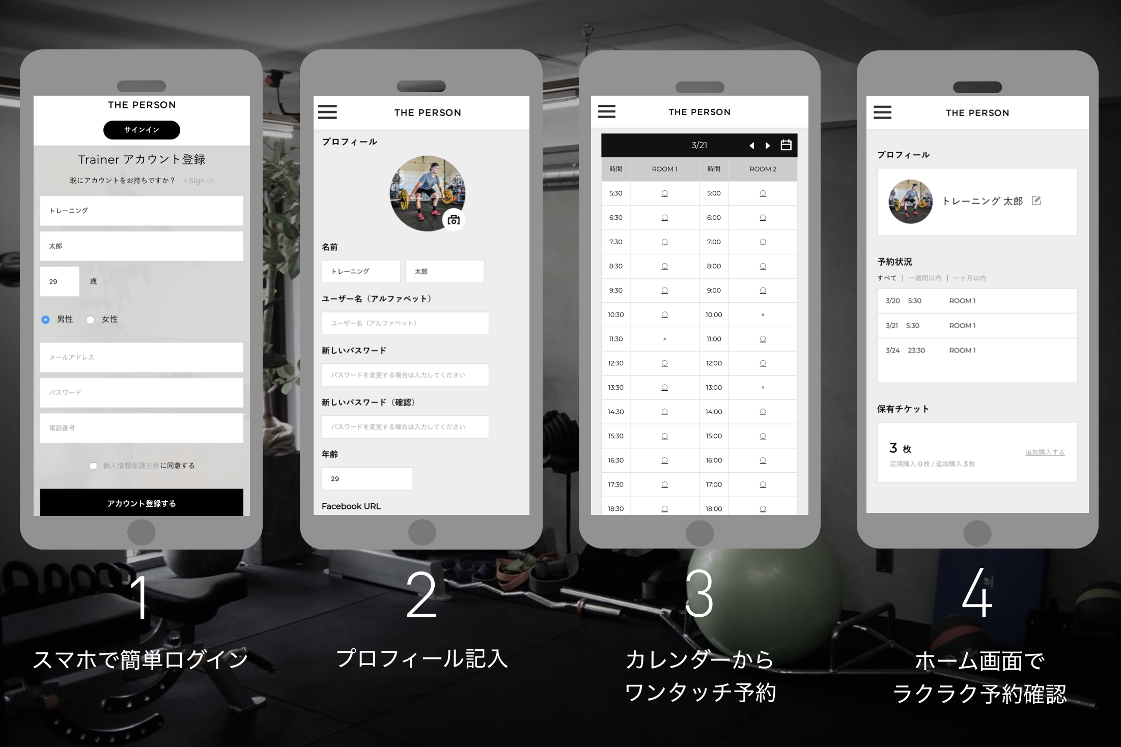 渋谷・新宿のレンタルジムTHEPERSONは、予約時間の調整でジムオーナーとのやりとりは一切不要。スマホから簡単に空き時間の確認と予約ができます。