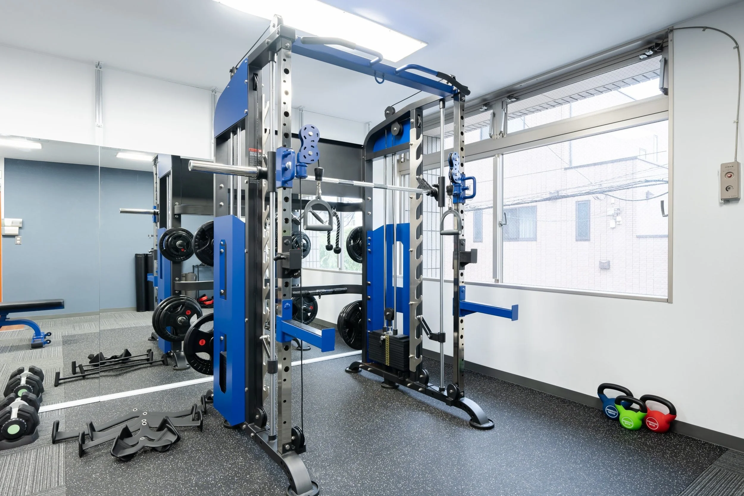 THE PERSONレンタルジム新大久保・東新宿 は、東新宿駅から徒歩4分。29 ㎡のスタジオに オールインワンラック(155 kgプレート) を据え、ラットプル・ロー・スミス軌道を1台でカバーします。