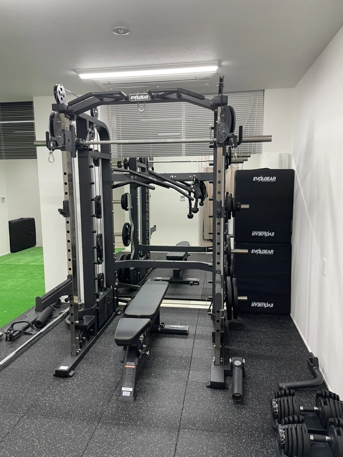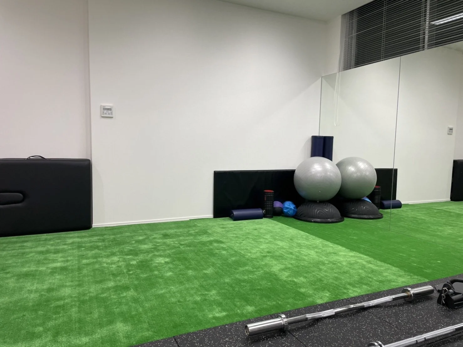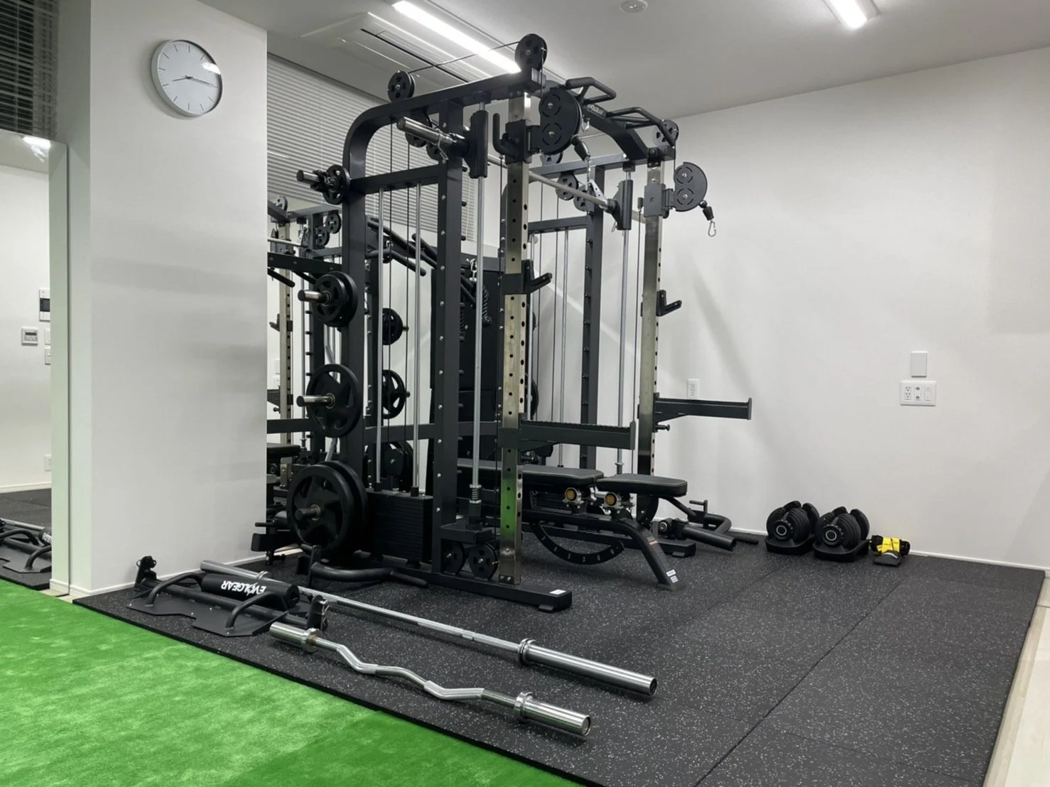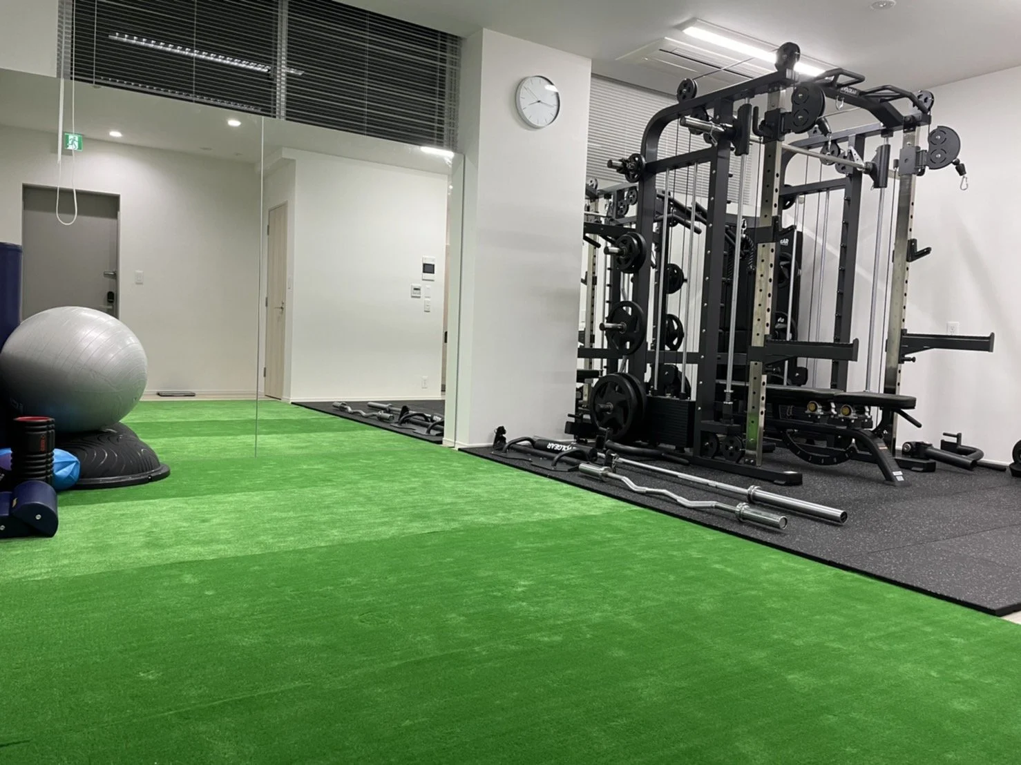 トレーニング器具はスミスマシンをはじめ、EZバー、バランスボール、BOSU、プッシュアップバーなどがあり、ボディメイクの他にも自体重でのトレーニングを行う際にメニュー作成がしやすいくらい器具が揃っており、バリエーションを豊富にメニューを組むことができます。そしてTHE PERSONレンタルジム白金台・高輪台はフロアの半分は人工芝になっておりますので、履き物を脱いでリラックスしながらストレッチをしていただくのもおすすめです。