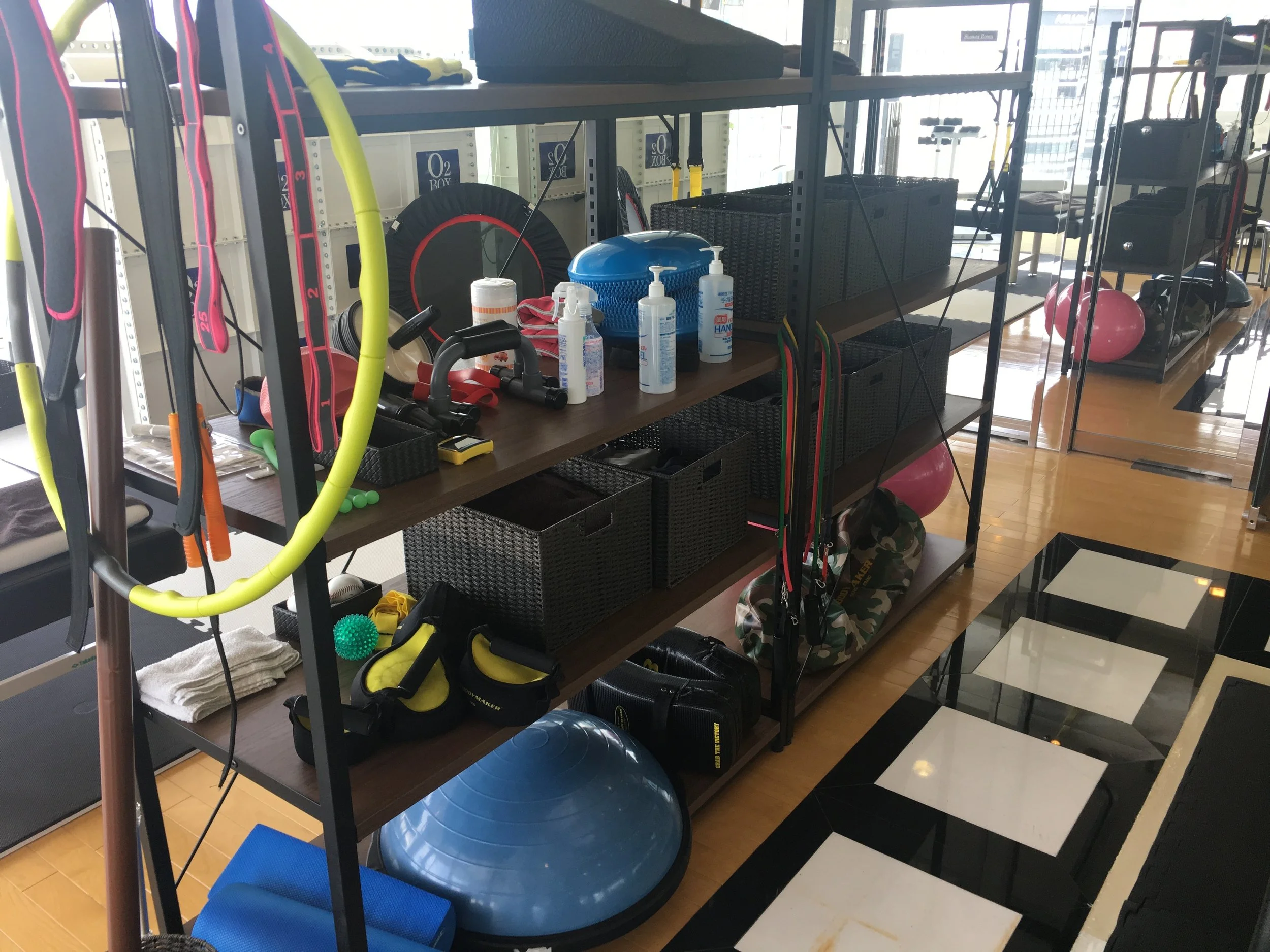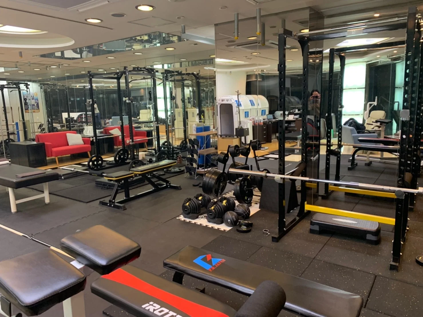 70㎡ほどある広いスペースにTRX、マッサージベット、パワーラックなどトレーニングに必要なものは全て揃っており、おまけに9F のガラス張りで景色も抜群。