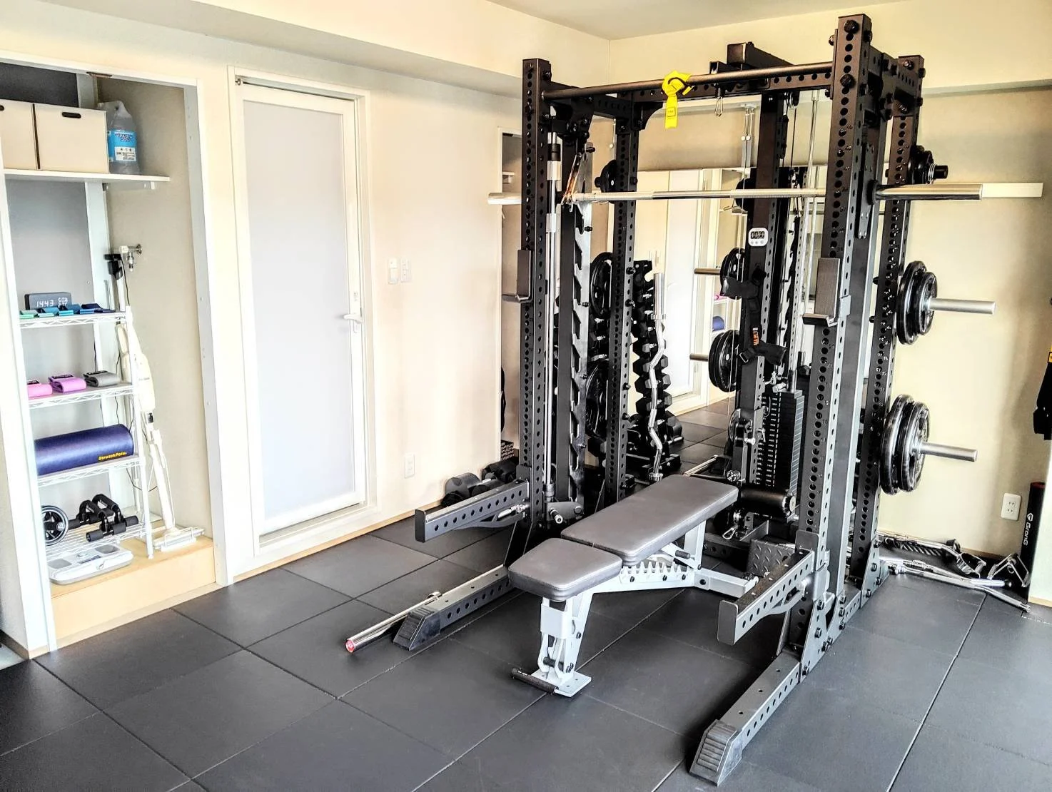 スミス/ハイ&ローケーブル一体型パワーラック + 107.5 kgプレート で BIG3 もラットプルも 1 台で完結。